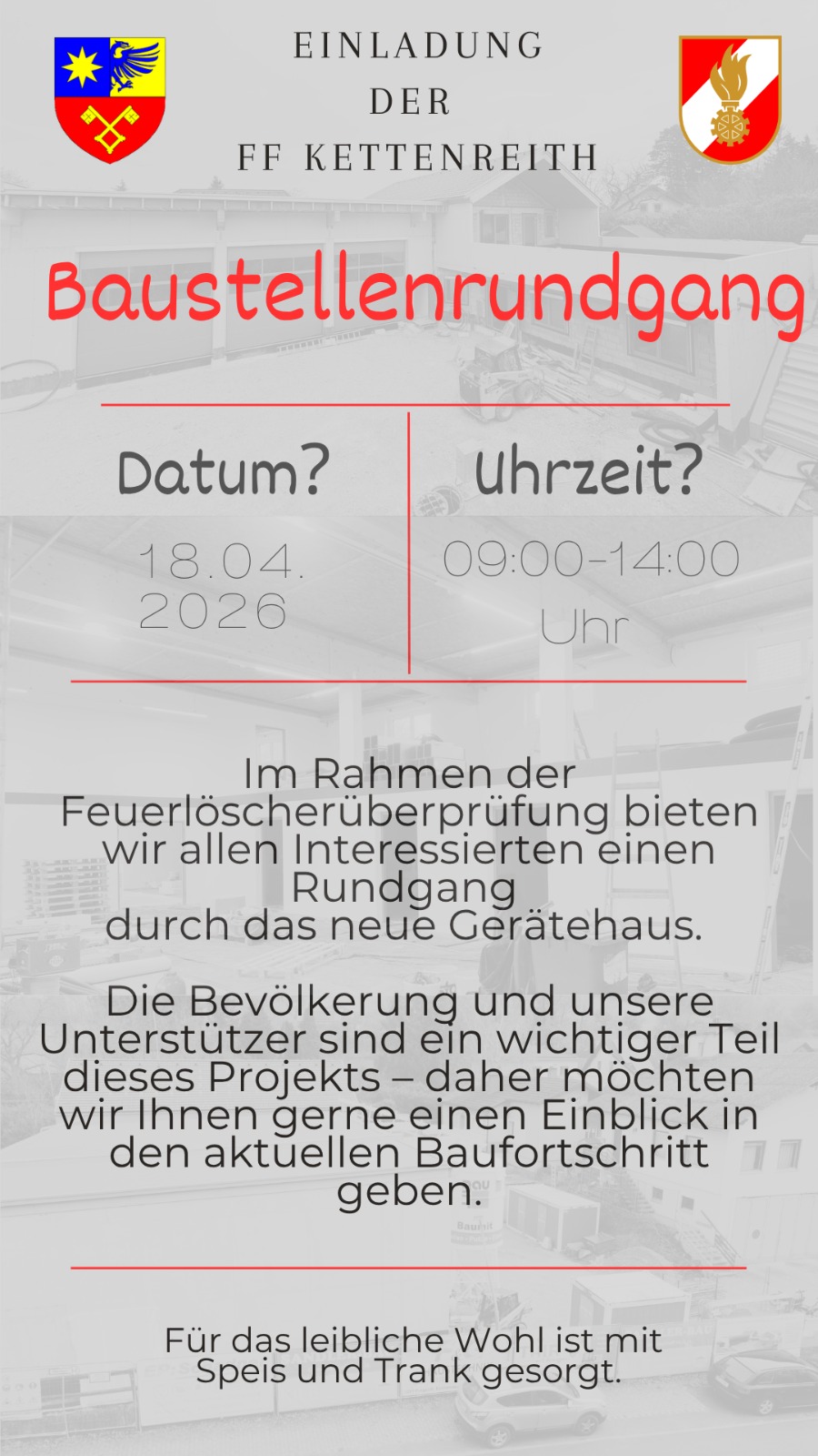 Im Rahmen dieser Aktion möchten wir allen Interessierten auch einen Rundgang durch das neue Gerätehaus anbieten. Die Bevölkerung sowie unsere zahlreichen Unterstützerinnen und Unterstützer sind ein wesentlicher Bestandteil dieses Projekts. Daher ist es uns ein besonderes Anliegen, Ihnen einen Einblick in den aktuellen Baufortschritt zu geben und zu zeigen, wie sich unser neues Feuerwehrhaus entwickelt.