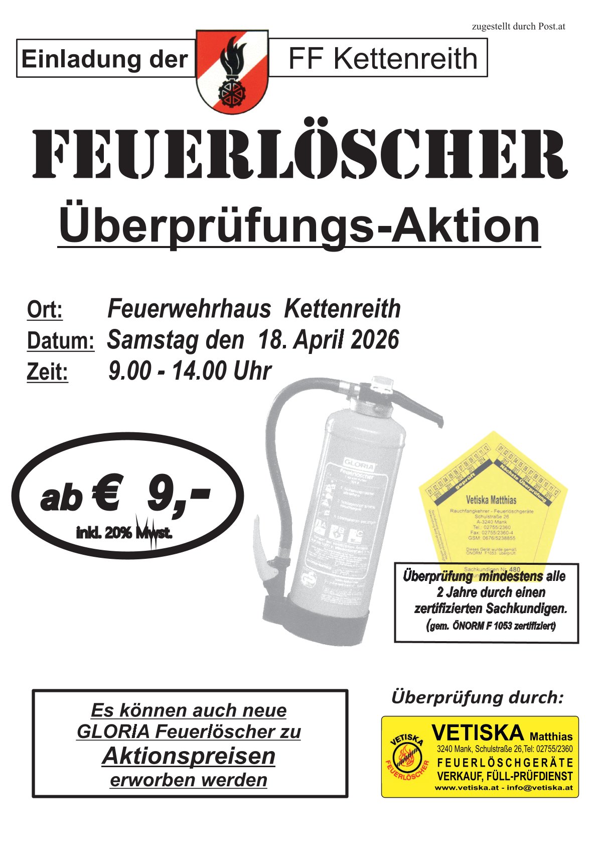 Am Samstag, dem 18. April 2026, von 09:00 bis 14:00 Uhr, haben alle Bürgerinnen und Bürger die Möglichkeit, ihre bestehenden Feuerlöscher im Feuerwehrhaus Kettenreith fachgerecht überprüfen und warten zu lassen. Nutzen Sie diese Gelegenheit, um die Sicherheit in Ihrem Zuhause zu gewährleisten. Darüber hinaus besteht die Möglichkeit, direkt vor Ort ein neues Löschgerät zum Aktionspreis zu erwerben.